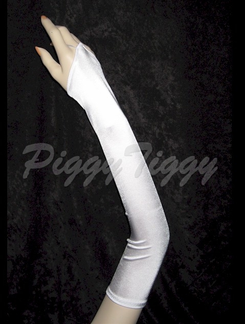 Gorgeous fingerless gloves. You can wear them during the ceremony and your groom can easily slip on your wedding ring. These gloves measure 23" long from fingertip to the glove opening. These are the longest gloves. These bridal gloves rise approximately 5" above the elbow. From the tip of the finger loop they measure approximately 18 inches long. The gloves will fit most women’s hands and arms as shown on the mannequin. The measurements that we provide are of the actual gloves. However the gloves may be a little shorter on the arms when put on if the arm circumference is bigger/wider depending on whether more or less fabric is taken to accommodate the arm circumference. These gloves have a smooth and silky finish which gives it an elegant look and is a lovely complement to any bridal dress fabric. One size fits most.