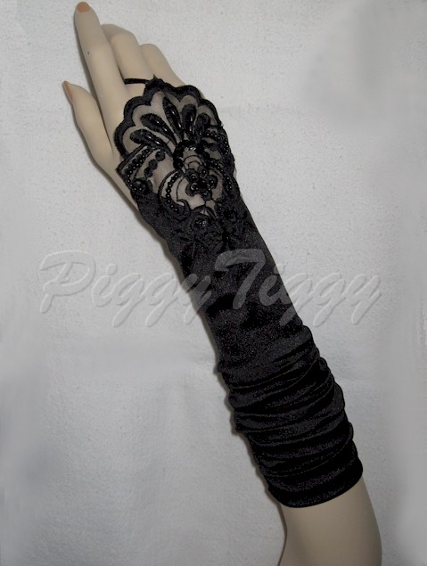 These are beautiful satin lace, beaded fingerless gloves. The beading and lace detailing on these gloves is absolutely gorgeous. You can wear them during the ceremony and your groom can easily slip on your wedding ring. The gloves are gathered on both seams for a romantic look. This glove ends just below the elbow. You can also stretch the gathers on the gloves tighter and the gloves can come up just over the elbow. When laying flat, the gloves measure 12" long. These gloves have a smooth and silky finish which gives it an elegant look and is a lovely complement to any bridal dress fabric.