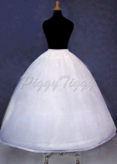 Description: This auction is for a beautiful 3 hoop petticoat/crinoline. This 3 hoop crinoline slip is the perfect slip to add fullness under your Bridal Gown, Ballroom Dress, Formal Wear and Prom dress. This petticoat/crinoline consist of 2 layers of tiered net and 1/2" lace trim. There is also a comfortable inner layer so the tulle net does not scratch or rub against your skin. This crinoline slip features a wide elastic waistband for a snug fit. The hoops are made of a strong flexible light weight metal frame that can be adjusted to decrease or increase the fullness of the slip. The lightweight framework is encased in a layer of fabric. The metals may be remove from the slip for machine washing purposes. The hoops are very flexible and allows you to loop the hoops around themselves making it small and compact to fit into a carrying bag. This petticoat/crinoline is strong enough to hold up the heaviest bridal/evening dress.